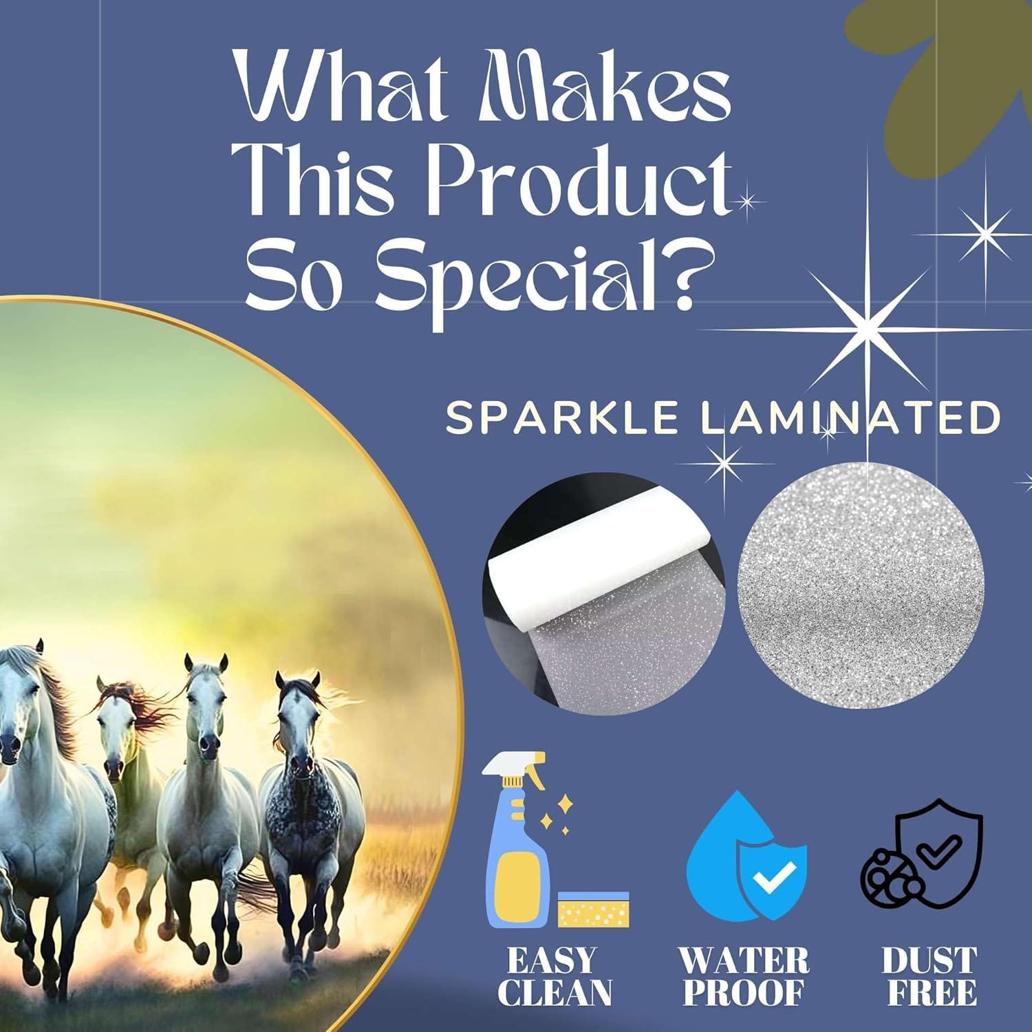 Premium 7 Horses Vastu Frame with Sparkle Lamination: This 7 horses wall painting with frame is printed on high-quality 250 GSM paper with a sparkle laminated finish, offering long-lasting vibrancy and elegance.