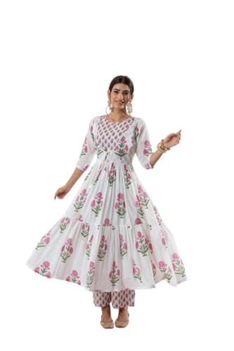 Revolze Women’s Cotton Floral Printed Long Anarkali Kurti with Pant and Dupatta