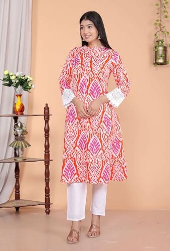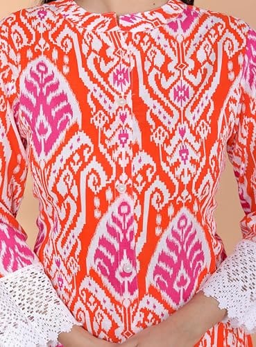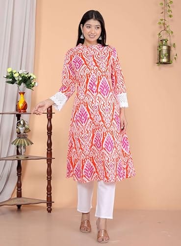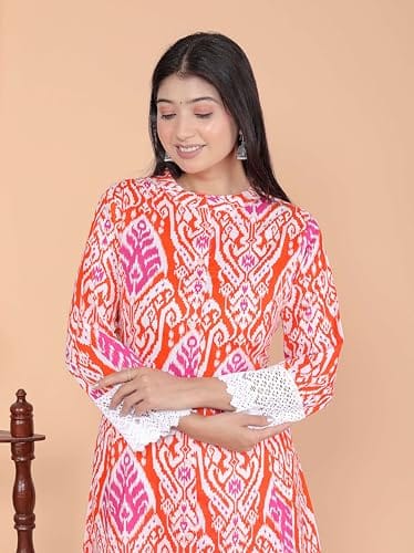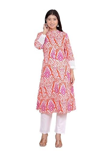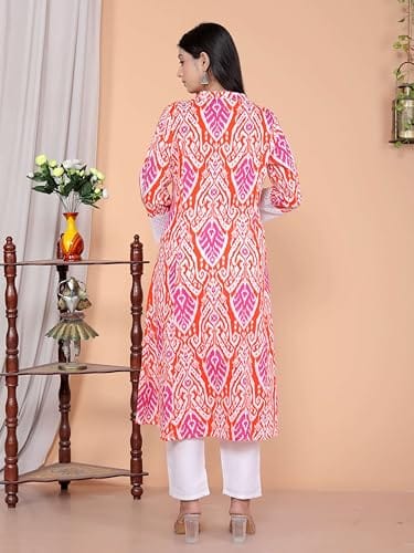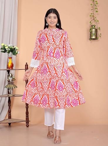 Be the first to review “Revolze Women’s Cotton Printed Mandarin Collar A-Line Kurti with Pant (Orange)” Cancel reply