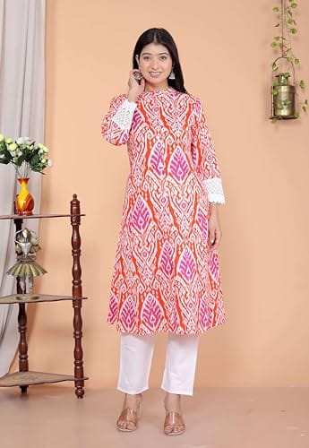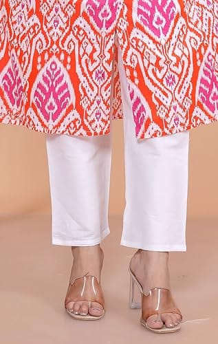 Revolze Women’s Cotton Printed Mandarin Collar A-Line Kurti with Pant (Orange)