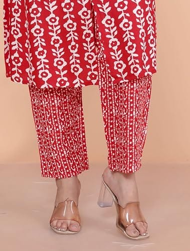 Revolze Women’s Rayon Floral Printed Mandarin Collar A-Line Kurti with Trousers (Red)